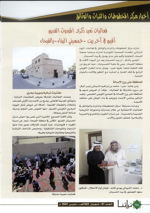 غطت مجلة تراثنا في عددها (81) الصادر في جمادي الأولى 1443 هجري الموافق مارس 2022 ، فعاليات عدة ومتنوعة لمركز المخطوطات والتراث والوثائق .